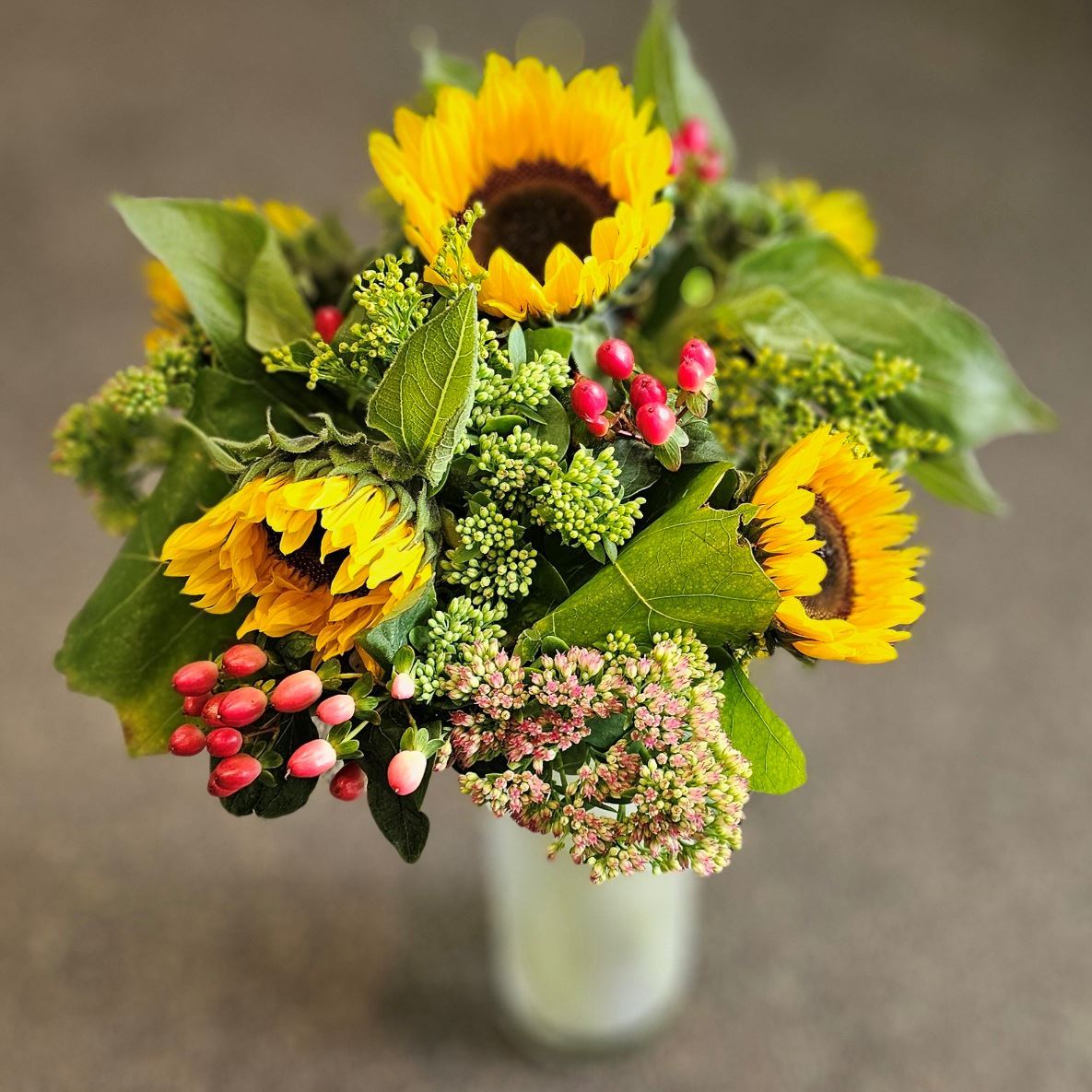 Gleðilegur vöndur blandaður með sólblómum,sedum, hyperikum ber og fullt af grænu fallegu efni