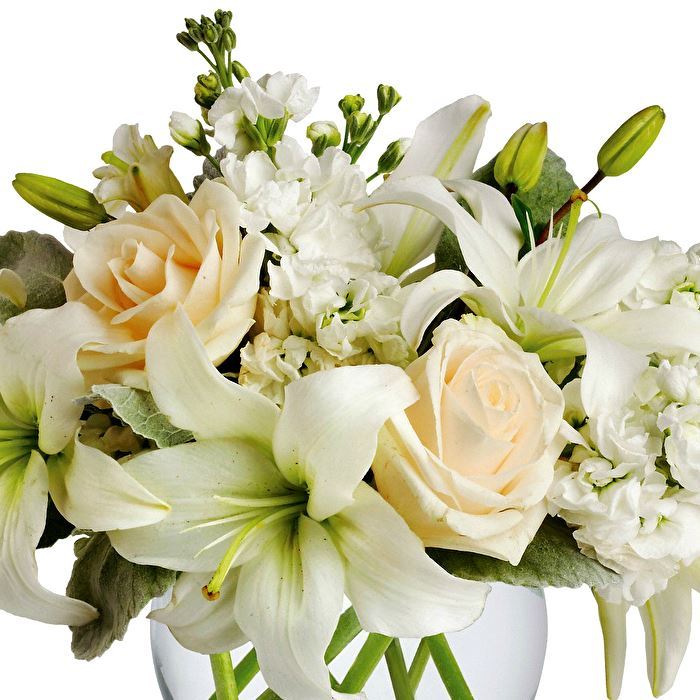 Stórglæsileg skreyting með hvítum og laxalituðum blómum í glervasa.